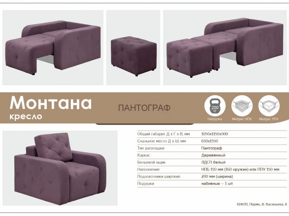 Кресло-кровать Монтана производства «DimarroMebel» по цене 28490руб. для уюта в вашем доме. Доступные цвета: Зеленый, Бежевый, Коричневый, Синий, Желтый. Фотографии и характеристики - в карточке товара. Похожие товары можно посмотреть в разделе «Кресла и кресла-кровати». Подоробности о Кресло-кровать Монтана узнавайте у наших менеджеров по телефону +7 (982) 675-60-72.